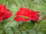 2007Kleurcontrast van de sprinkhaan en de roos.
