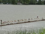 2013Een ganzenpaar met een enorme hoeveelheid jongen op een rij.